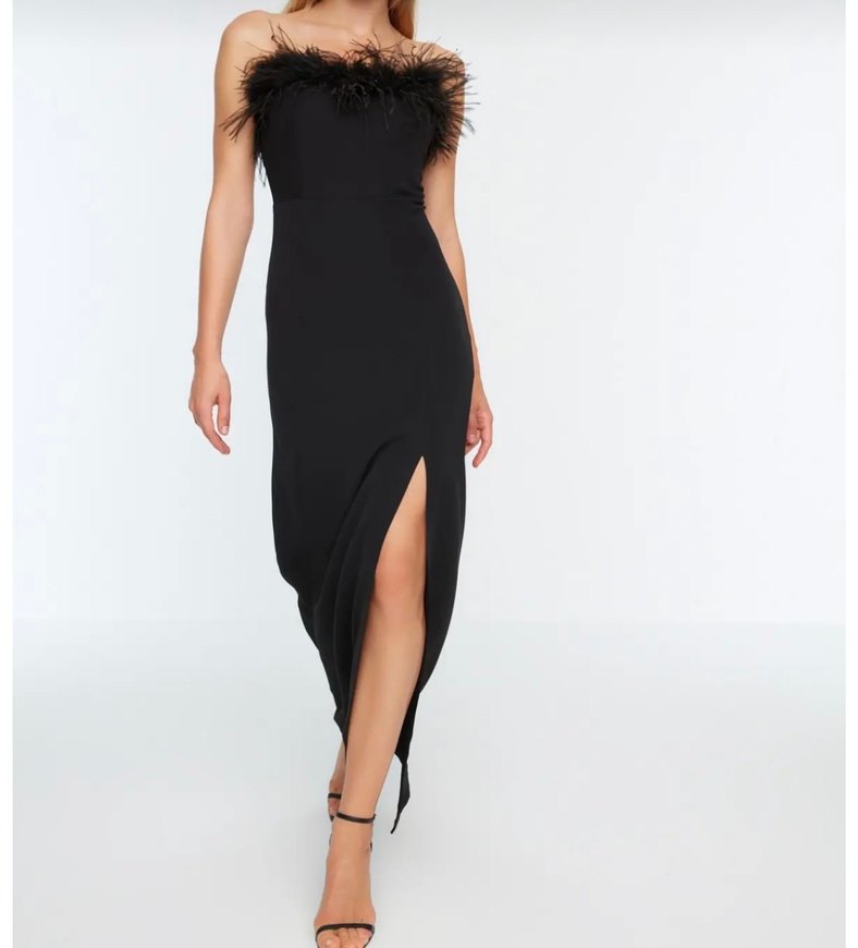 Siyah uzun straplez elbise, drapeli ve tüy detaylıdır. İnce askılı, sırtı oturan kesimiyle romantik akşamlar için uygundur.