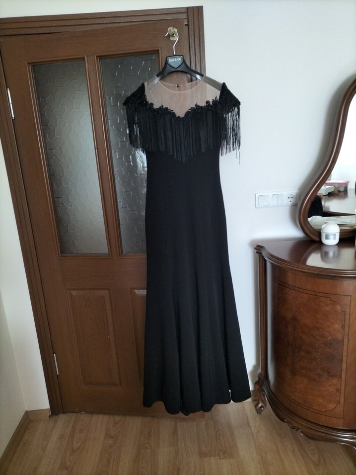 Siyah, uzun ve straplez olan bu elbise, drapeli detaylara ve ince askılara sahip, klasik gotik şıklığı yansıtır.