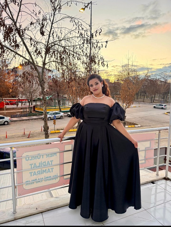 Siyah uzun straplez, drapeli ve bol kesim elbise. Kısa balon kollu, klasik zarif tarzda, düğünler için uygun.