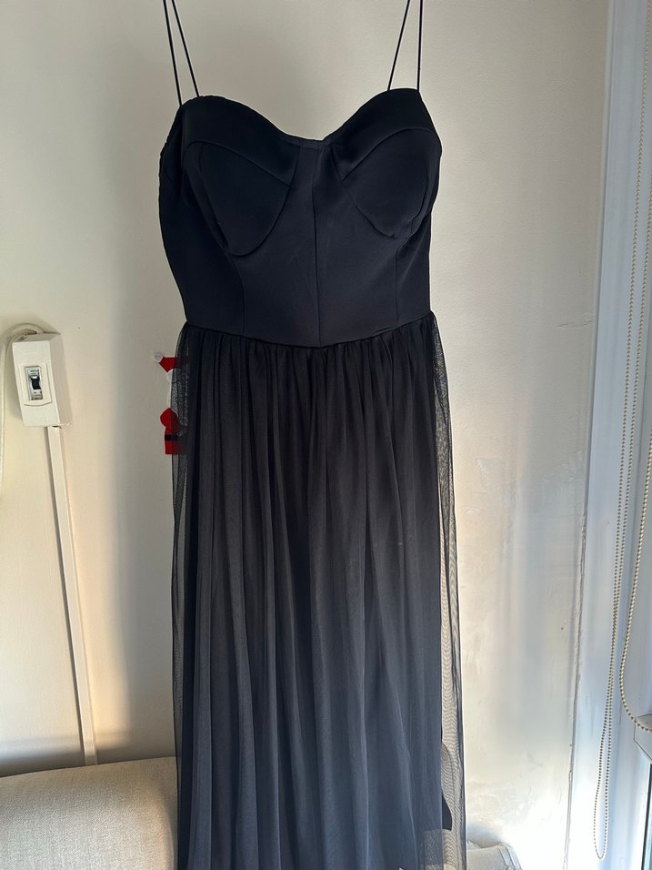Bu siyah, uzun ve straplez abiye elbise, ince askılar ve drapeli etek detayına sahip olup gotik tarzıyla romantik akşamlar için uygundur. Fit kesim ve desensiz tasarıma sahiptir.