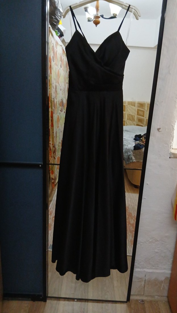 Bu siyah, uzun ve straplez abiye elbise, drapeli detayları ve gotik tarzıyla klasik bir şıklık sunar. Düğün için uygundur.