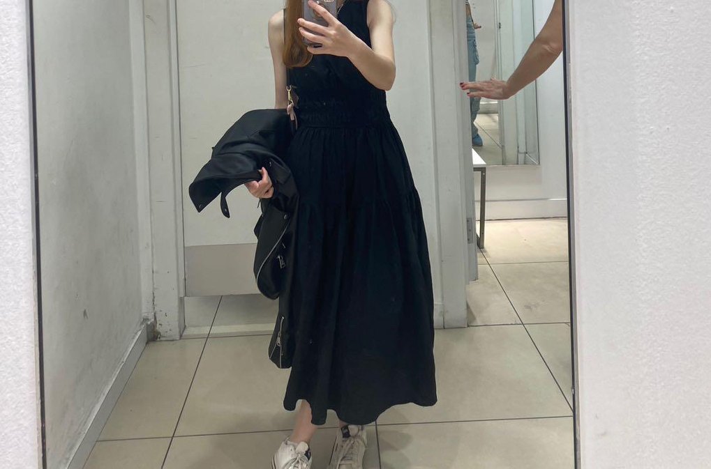 Siyah renk, uzun boy, straplez kesim ve askılı kollara sahip, bol ve drapeli gotik tarzda sentetik kumaştan yapılmış elbise.