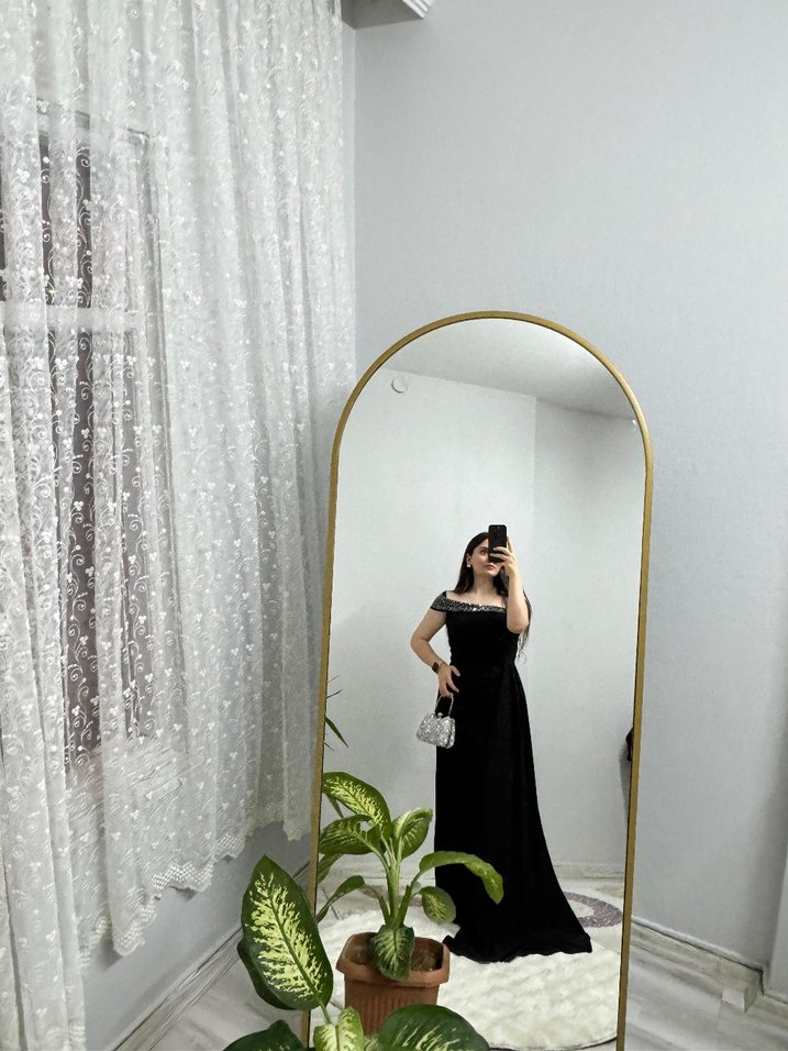 Siyah uzun straplez yakalı, askılı kollu ve drapeli tasarıma sahip klasik zarif gotik gelinlik.