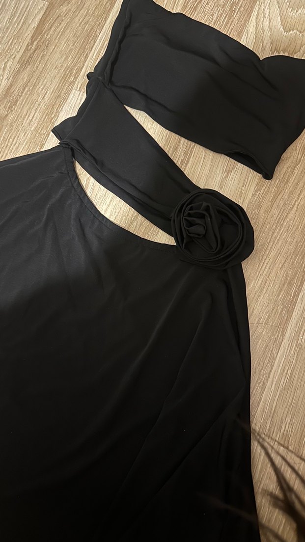 Siyah, uzun ve straplez yaka, ince askılı, vücuda oturan, drapeli gotik tarzda gece elbisesi, partiler için uygun.