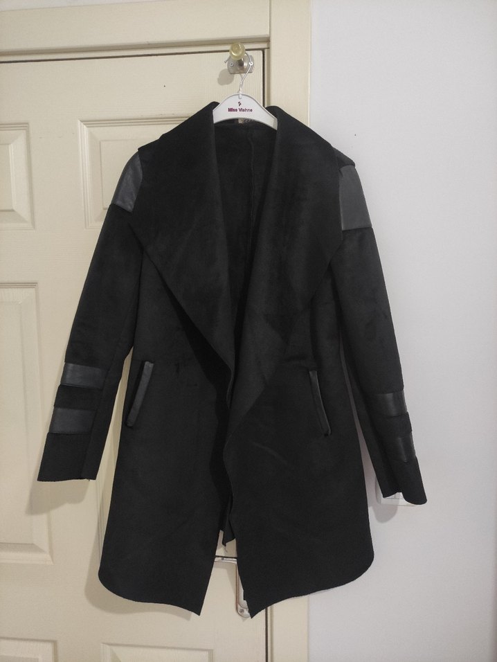 Siyah uzun süet kaban, geniş yaka ve kürk detaylara sahiptir. Düz desensiz, uzun kollu ve rahat kesimdir, günlük sokak stili için uygundur.