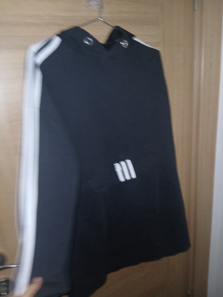 Siyah, fermuarlı, uzun kollu ve yüksek yakalı, sentetik kumaştan yapılmış, spor tarzda midi hamile ceketi. Beyaz şerit detayları bulunur.