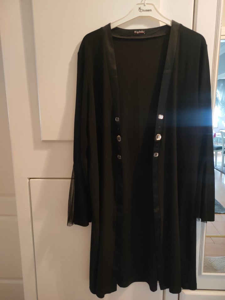 Siyah uzun taşlı hırka, yakalı ve satenimsi kumaştan. Düzenli kesim, uzun kollu kollarında tül detayı var,sadece 1 kere giyildi temiz ve sorunsuzdur