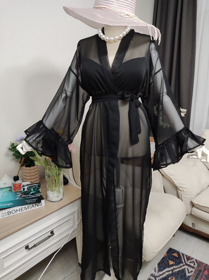 Siyah, uzun, bol kesim ve askılı kollu transparan kumaştan yapılmış gotik tarzda kadın pareo belden bağlamalı.