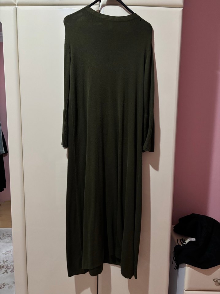 Standart bedendir. 1 defa giyildi. Yaka kısmında ufak bir kusuru vardır şalla kapanıyor. O yüzden fiyatı çok az yazıyorum. Siyah uzun keten elbise, bol kesim ve drapeli detaylara sahiptir. Uzun kollu, yuvarlak yaka ve minimalist tarzda, günlük kullanıma uygundur.