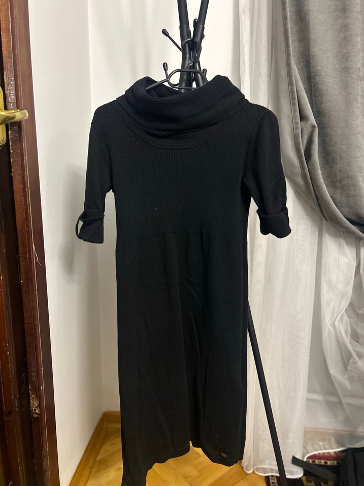 Siyah uzun triko elbise, yüksek yakalı ve drapeli detaylı, uzun kollu ve vücuda oturan kesimiyle minimalist goth tarzını yansıtıyor. Yarım kollu kışlık kumaş boğazlı orta boy