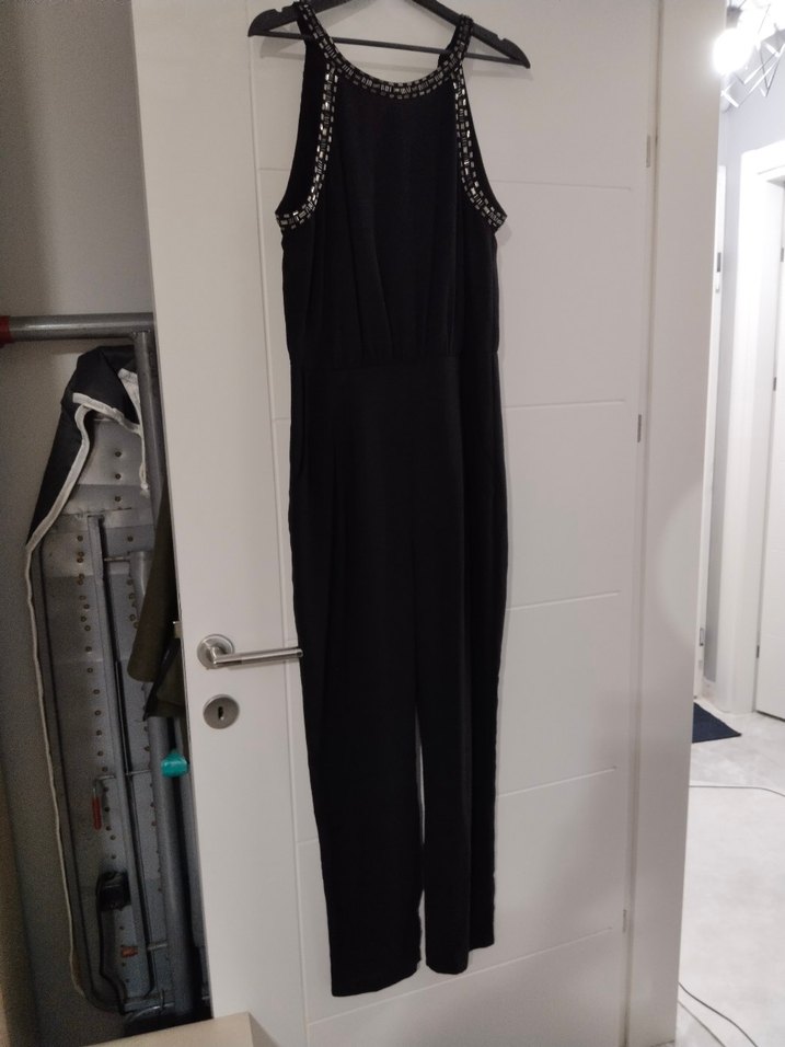 yüksek yakalı ve askılı siyah uzun tulum, gotik romantik akşamlar için uygun. Pürüzsüz sentetik kumaştan üretilmiştir.
