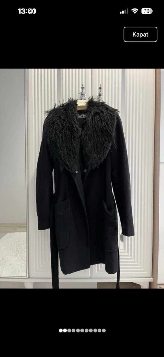 Ön cepli, kuşaklı ve uzun tüylü yaka detaylı siyah kaban.