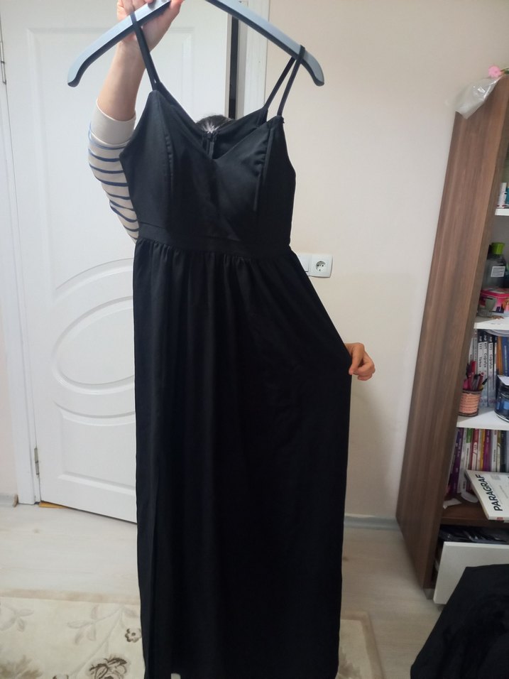 Siyah, uzun, V yakalı yırtmaçlı belden oturtmali kloş elbise