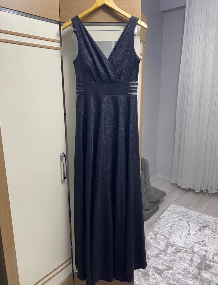 Mezuniyet töreninde bir defa giyilmiş uzun gece elbisesi, V yaka ve askılı detaylara sahiptir. Drapeli önü, simli iç astarlı kumaşı ✨