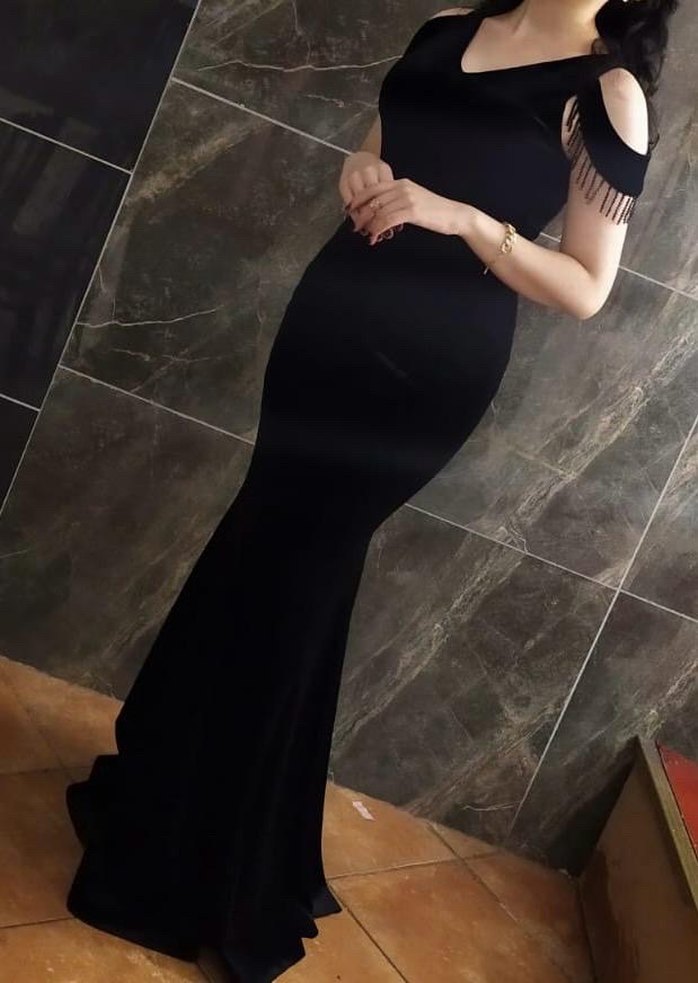 Drapeli V yakalı, kol detayları açık ve askılı, siyah uzun abiye elbise. Dikkat çekici ve şık bir tercih. Ben 2500 TL ye almıştım sudan ucuz
