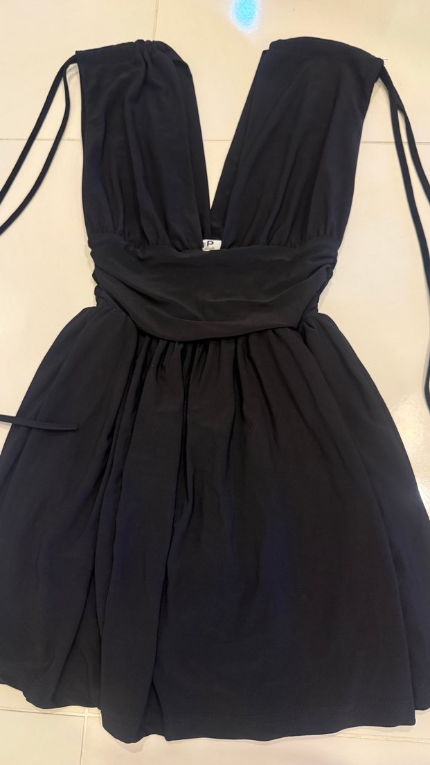Drapeli tasarımı ve ince askılı uzun siyah abiye elbise, derin V yaka ile romantik akşamlar için uygundur. Gotik ve Parisli stilini yansıtır.