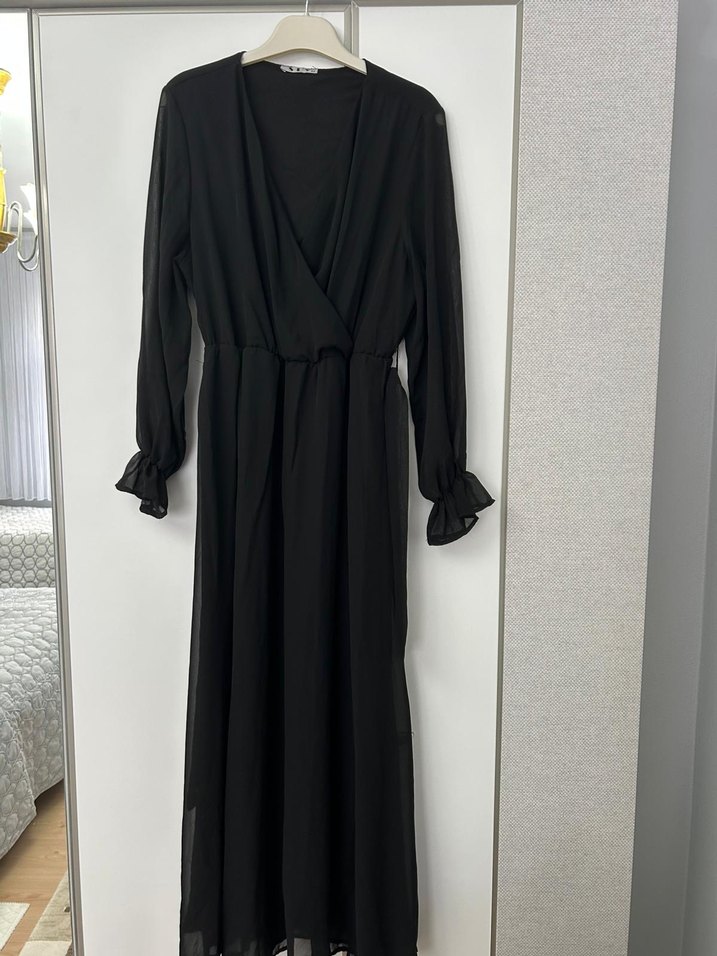 Siyah midi boy elbise, V yaka ve bol kesimle drapeli detaylara sahiptir. Uzun kollu ve fırfırlı 1 kez giyildi