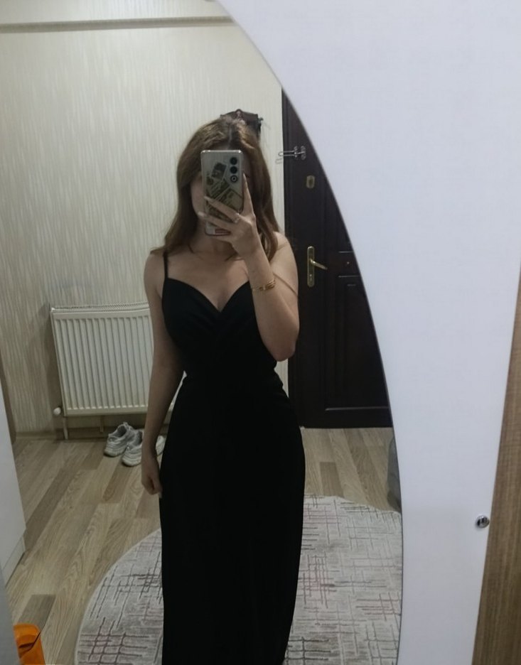 Siyah uzun elbise, V yakalı ve ince askılı, ipeksi kumaş ve drapeli detaylara sahip, romantik akşamlar için uygun.