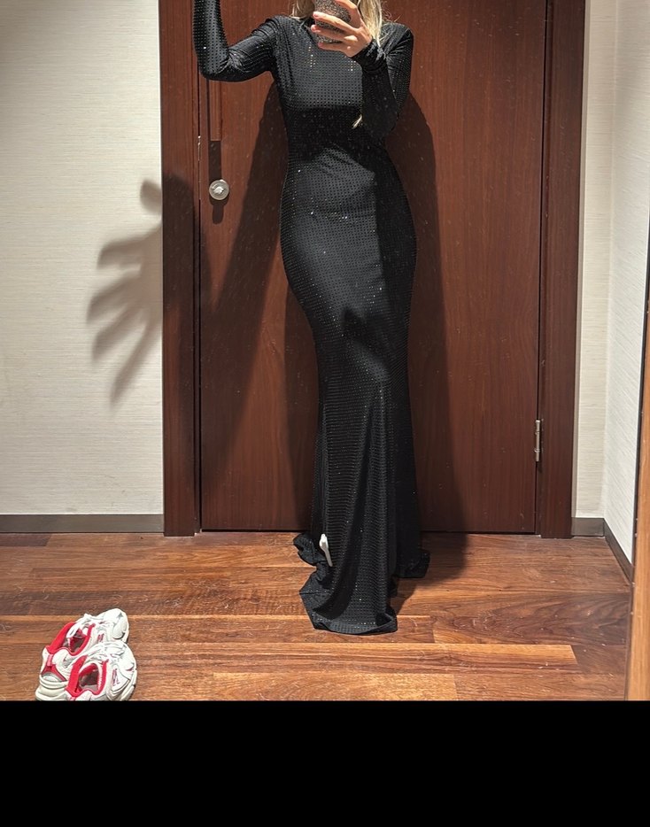 Siyah uzun ve vücuda oturan elbise, ipeksi dokusu ve drapeli detaylara sahiptir. V yaka ve ince askılı kolludur, gösterişli parti tarzı için uygundur.