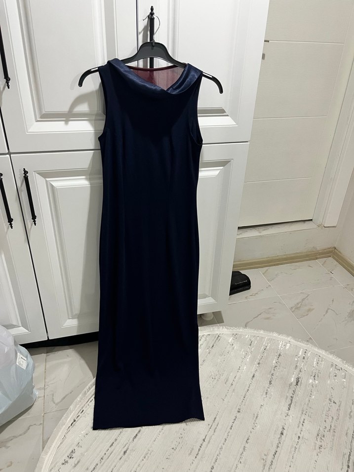 Siyah, uzun ve v yaka drapeli, kolsuz, ince kesim kadın elbisesi. İpeksi dokusu ve gotik tarzıyla romantik akşamlar için uygun.