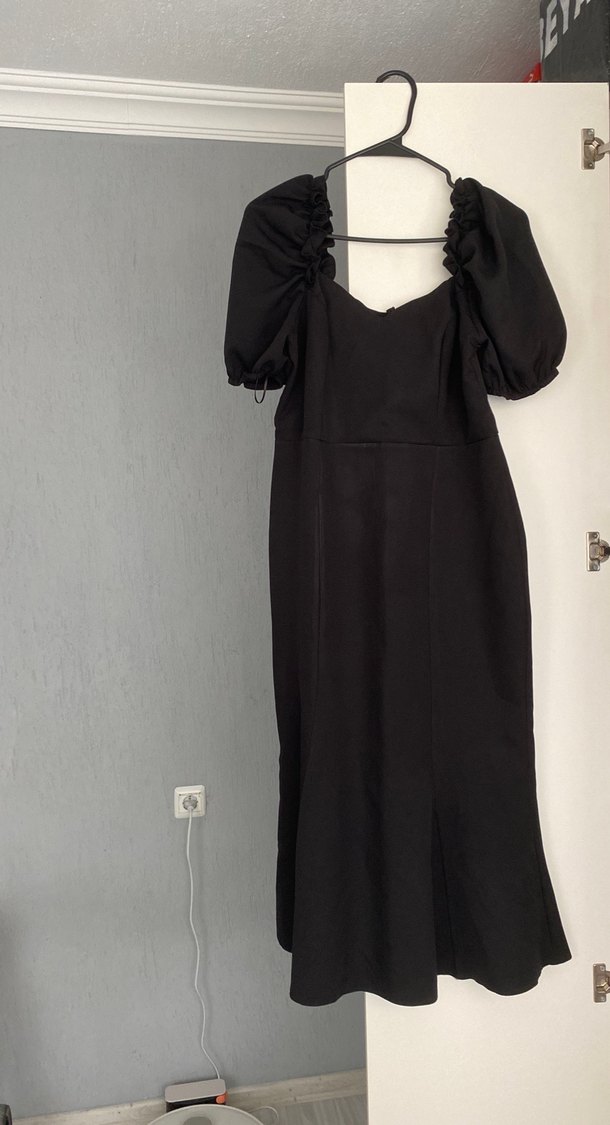 Siyah Uzun V Yaka Drapeli Keten Elbise