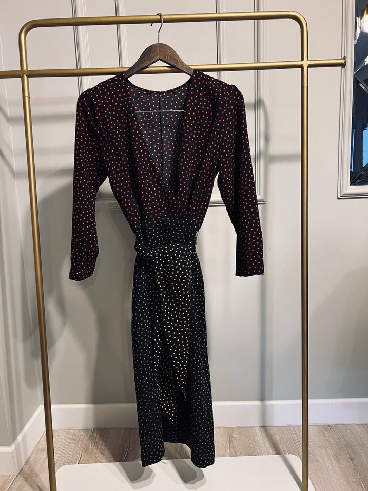 Siyah, puantiyeli, uzun ve v yakalı bu elbise, kemerli ve ince kesimdir. İpeksi kumaştan yapılmış olup romantik akşamlar için uygundur.