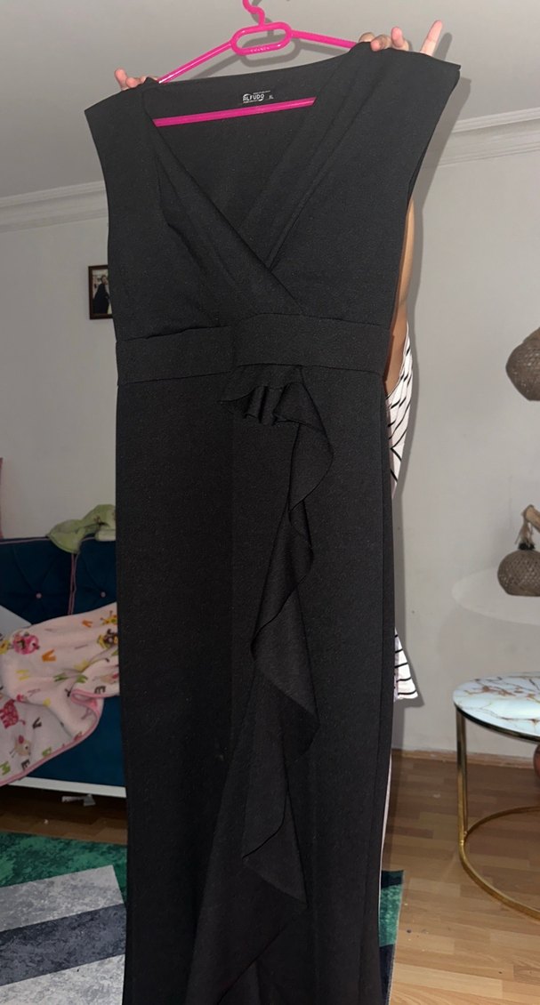 Siyah uzun gece elbisesi, V yaka ve kolsuz tasarıma sahip. Önde fırfır detayı bulunan bu dar kesim elbise, ofis için uygun ve gotik tarzda.