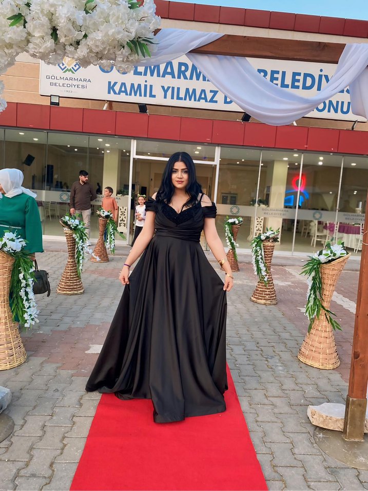 Siyah uzun elbise, V yakalı ve askılı kollu drape tasarıma sahip, cesur gotik tarzda ve normal kesimlidir, düğünler için uygundur. ✨