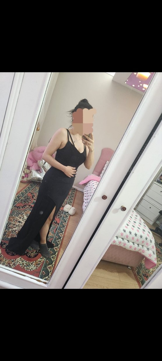 V yaka ve ince askılı, siyah uzun ve vücuda oturan bu elbise, gotik tarzı ve romantik akşamlar için uygundur.