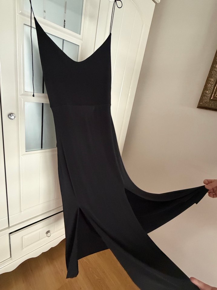 İnce askılı, V yaka, uzun ve siyah renkli bu elbise, satenimsi kumaştan ve drapeli tasarıma sahiptir. Minimalist gotik tarzı yansıtır, romantik akşamlar için uygundur.