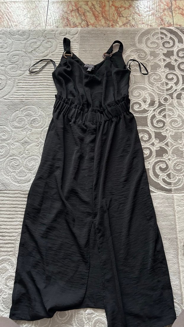 Siyah, kolsuz, V yakalı, bol kesim ve drapeli detaylara sahip uzun elbisedir. karışık kumaştan üretilmiştir.