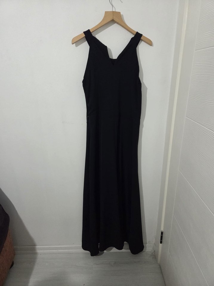 Siyah, kolsuz, V yaka uzun elbise, şık drapeli ve ince dokulu kumaşıyla ofis için uygun minimalist gotik tarzda.