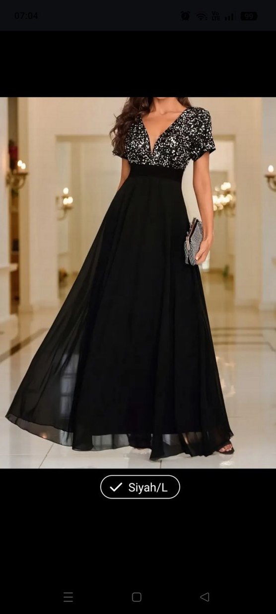 Siyah uzun elbise, V yaka yarım kol detayına sahip. Baskılı ve drapeli üst kısmı, payetli.belden bol tül kesimiyle şık bir akışkan siluet sunar.gogus 95/101 bel 75/81 basen 100/106 uzunluğu 176cm