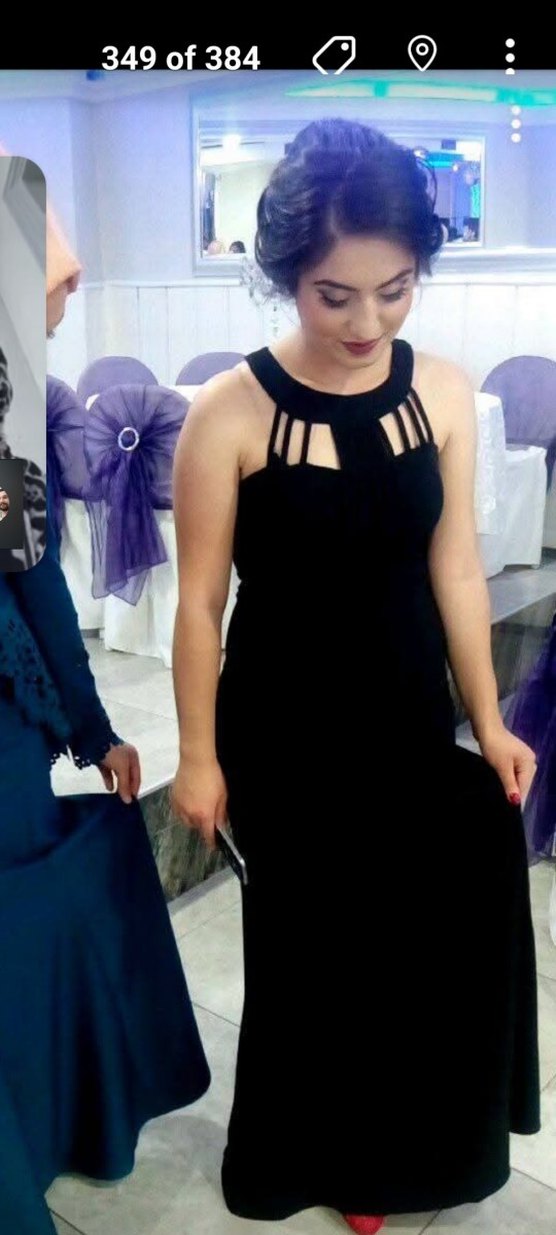 Siyah, uzun ve dar kesim gotik elbise, V yaka, strappy askılar ve yırtmaç detayına sahip, cesur parti tarzı için uygundur.
