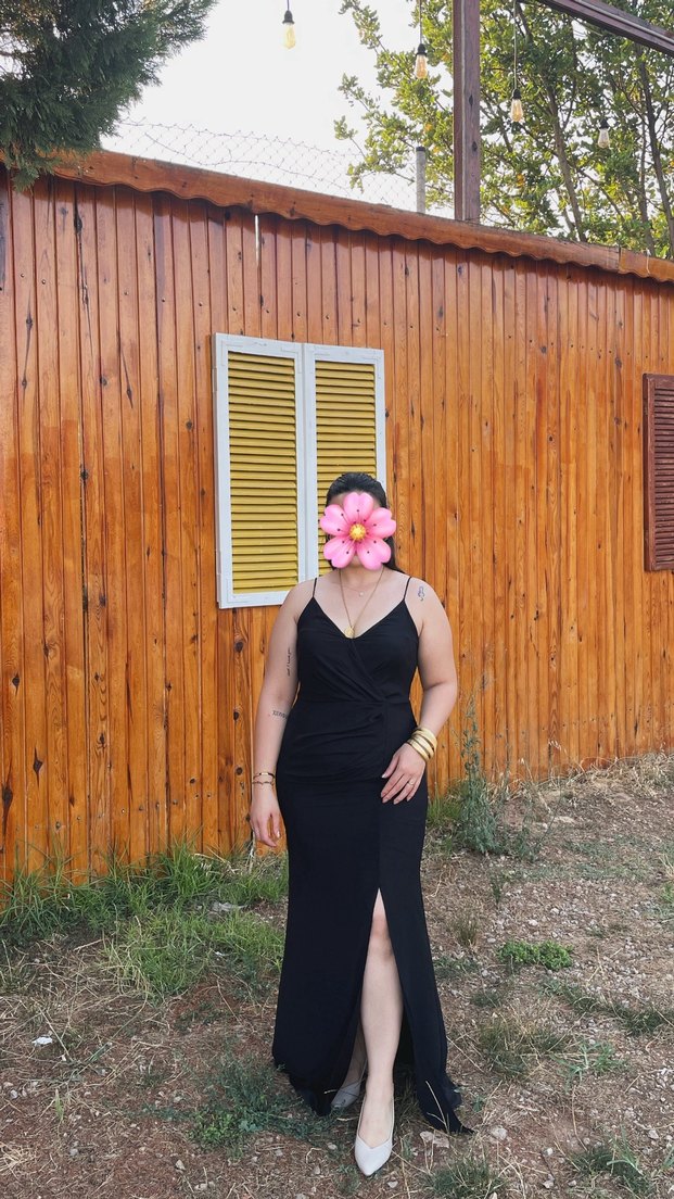 Siyah Uzun V Yaka Yırtmaçlı Kadın Elbise