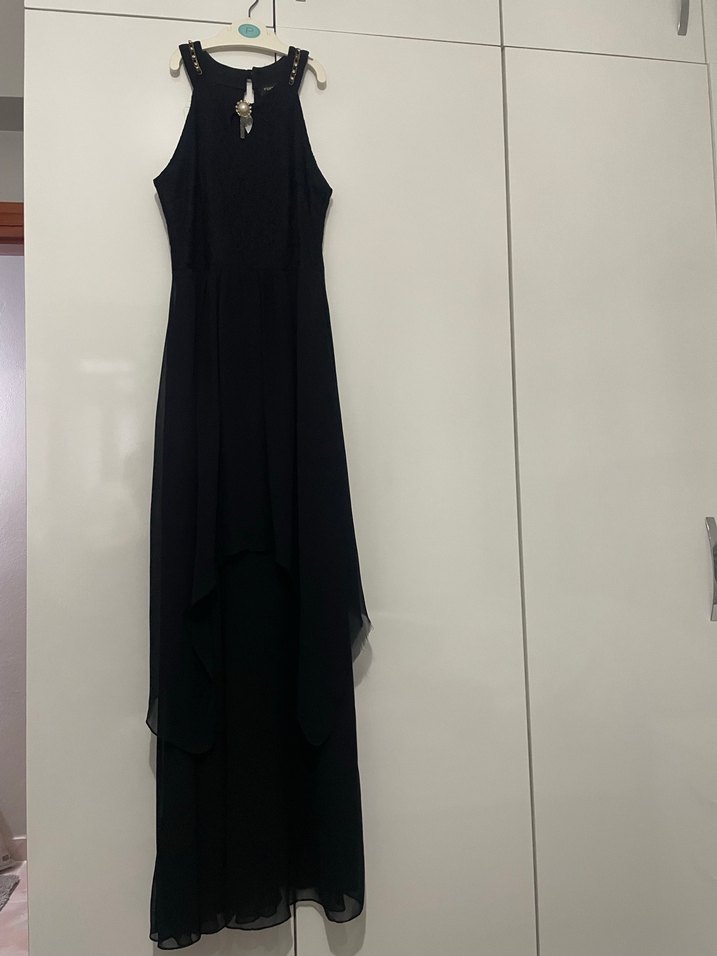 Siyah, v yakalı, kolsuz ve drapeli uzun elbise, gotik tarzda klasik şıklık sunar.