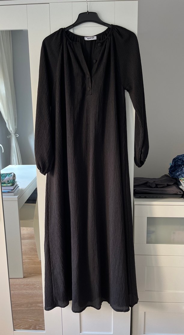 Uzun kol ve V yakalı, keten kumaştan siyah uzun elbise. Salaş kesim ve dökümlü tasarımıyla minimalist bohem tarzını yansıtıyor. Omuzdan etek ucuna 1.25 boy
