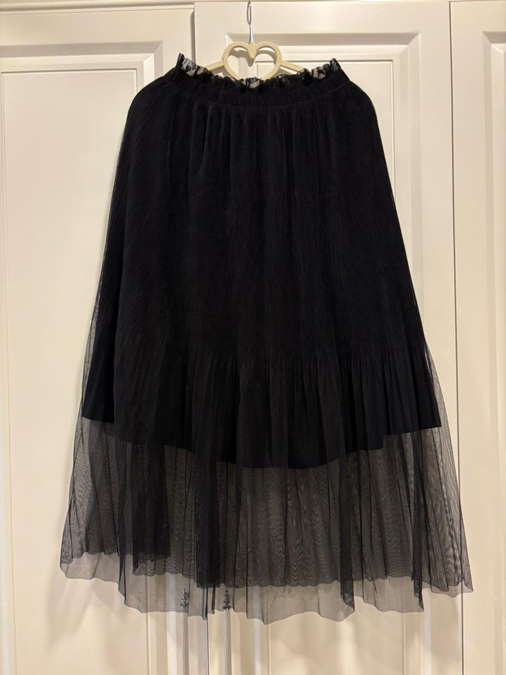 Siyah uzun etek, volan detaylı ve ince tül alt katmanlıdır. Sentetik kumaştan olup, bol kesimdir ve gotik tarza uygundur. Etiketsiz s m olur lastikli