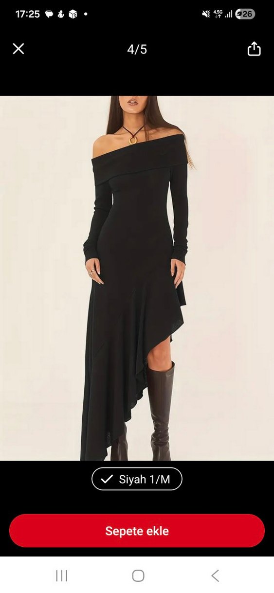 Siyah kumaştan, uzun kollu, drapeli kayık yaka ve asimetrik etek ucu olan, fit kesim uzun elbise. Gotik ve şık günlük tarz için uygundur. zara değildir.