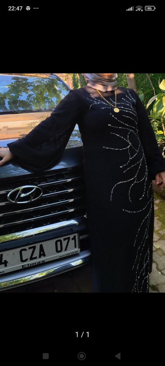 Siyah uzun elbise, V yaka ve dökümlü uzun kolludur. Nakışlı deseni ile düzenli kesim sunar, düğün için uygundur.