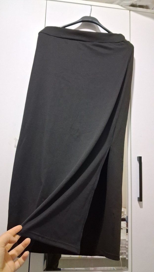 Düz siyah, dar kesim uzun etek, yırtmaç detayıyla minimalist ve gotik tarzda, günlük kullanıma uygun.