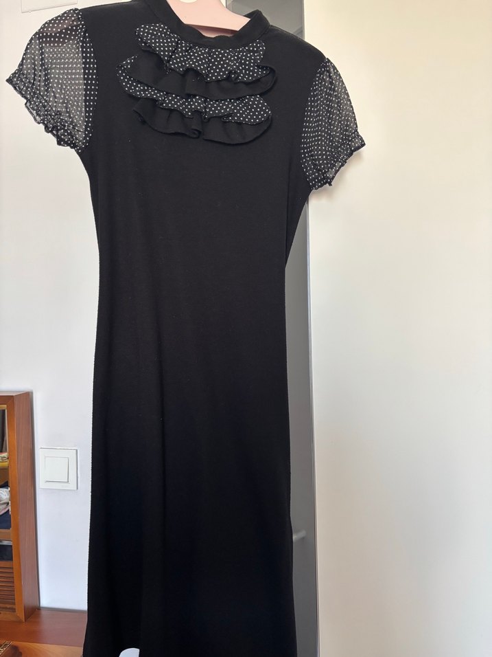Siyah uzun elbise, yüksek yakalı ve fırfırlı detaylara sahip. Kısa, puantiyeli tüllü kollar gotik tarzı tamamlar.