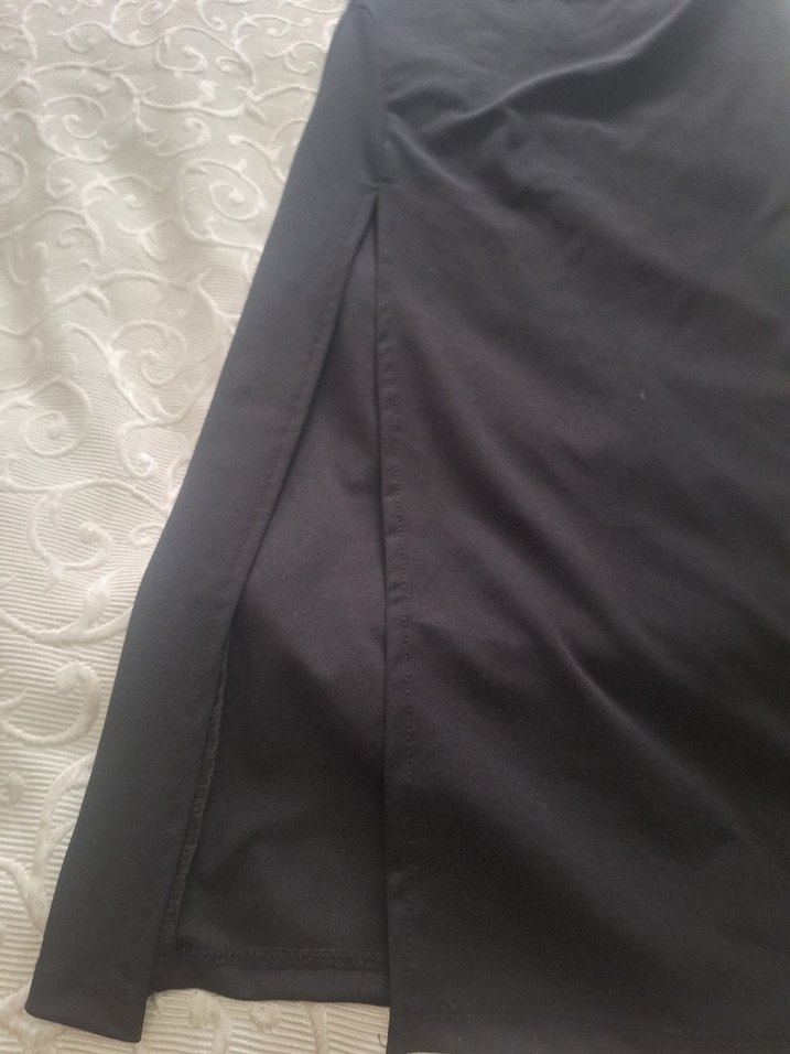 Yumuşak sentetik kumaştan yapılmış, yırtmaçlı ve vücuda oturan uzun siyah etek. Günlük kullanım için streetwear ve athleisure tarzlarına uygundur.