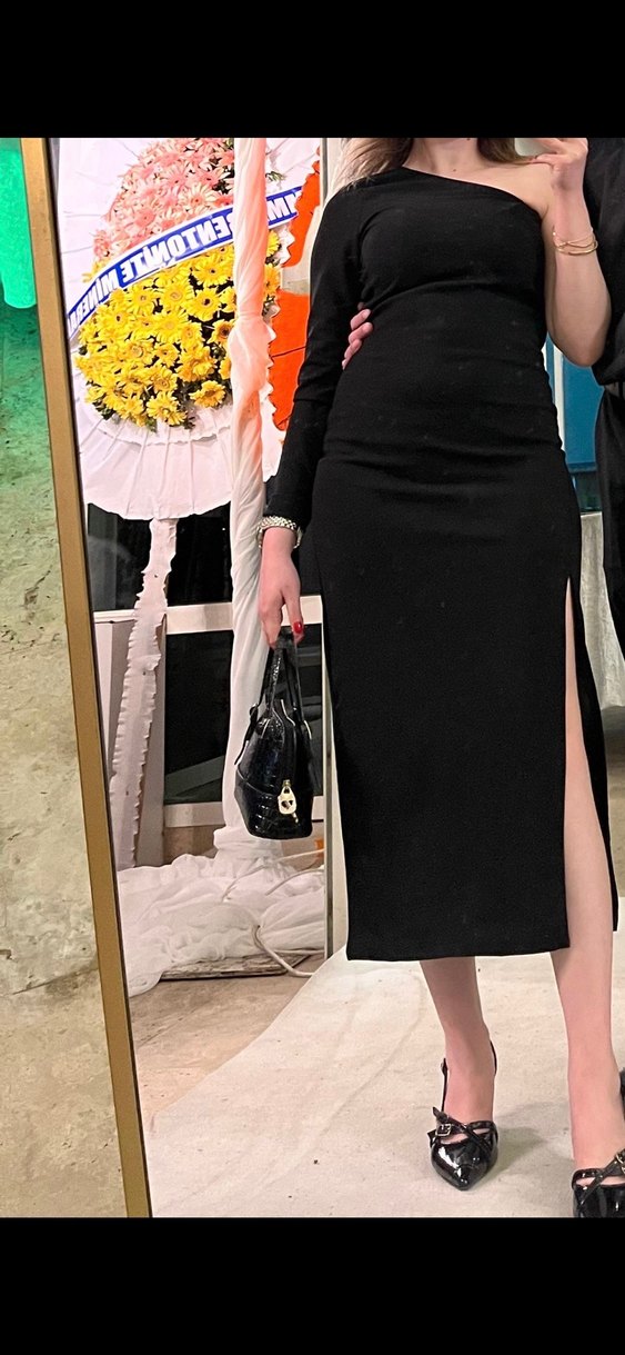 Siyah uzun yırtmaçlı elbise, çapraz koldur