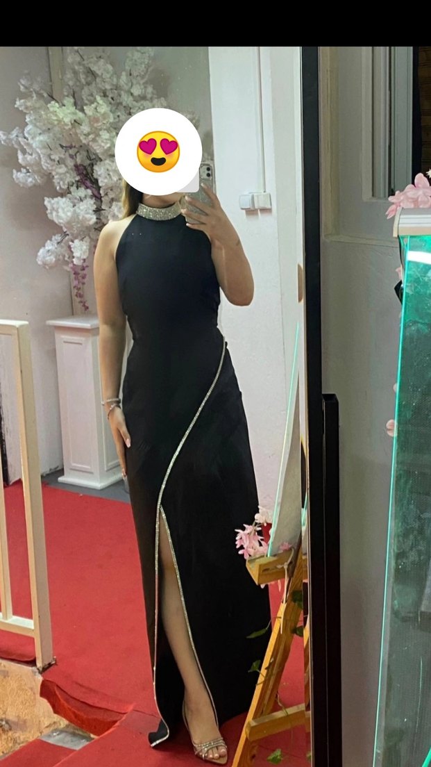 Yüksek yakalı, askılı kollu ve yırtmaçlı siyah uzun abiye elbise, partiler için fit kesimde şık ve modern bir tasarım sunar.boyun ve yırtmacı kısmı ful pırlanta taş kaplama 1 kez kullanıldı 5 bin tlye almstım