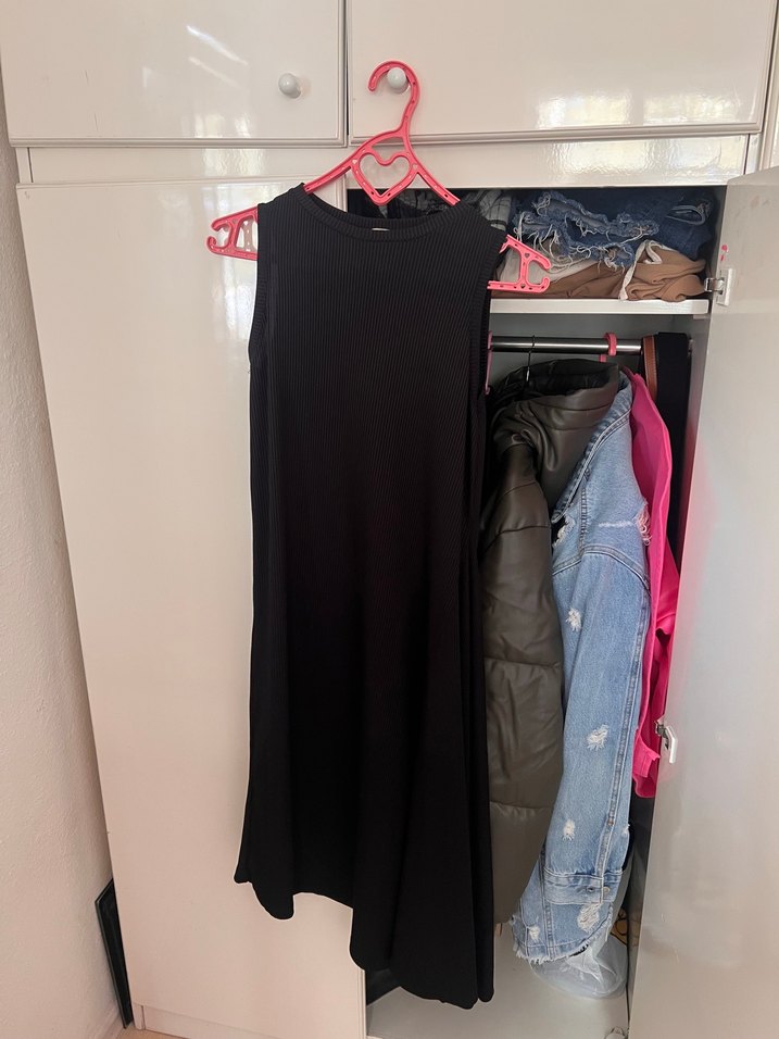 Siyah, uzun, yüksek yakalı, kolsuz, sentetik kumaştan yapılmış, drapeli ve vücuda oturan elbisedir. Günlük kullanım için uygundur. Asimetrik arka kısmında biraz kusuru var en sonda gösterdim #elbise #siyah #uzun