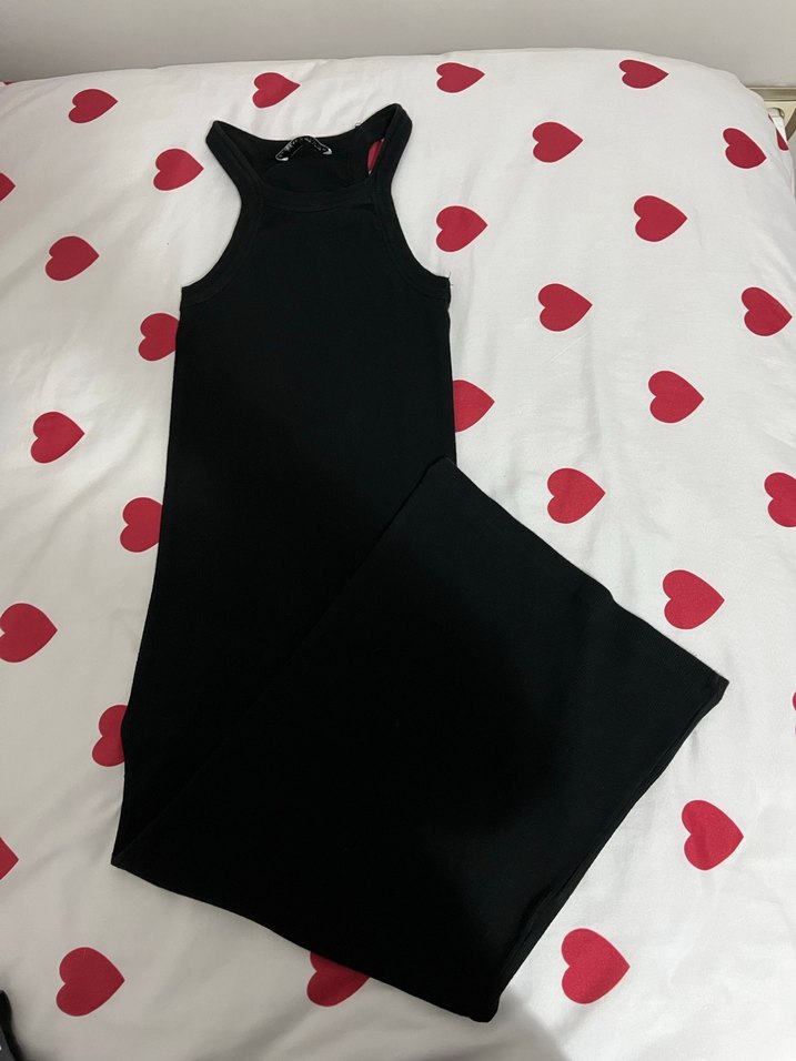 Siyah, uzun ve vücuda oturan bu elbise yüksek yakalı ve kolsuzdur. Düz ve sentetik kumaştan yapılmış, romantik akşamlar için şık ve rahat bir tercihtir.