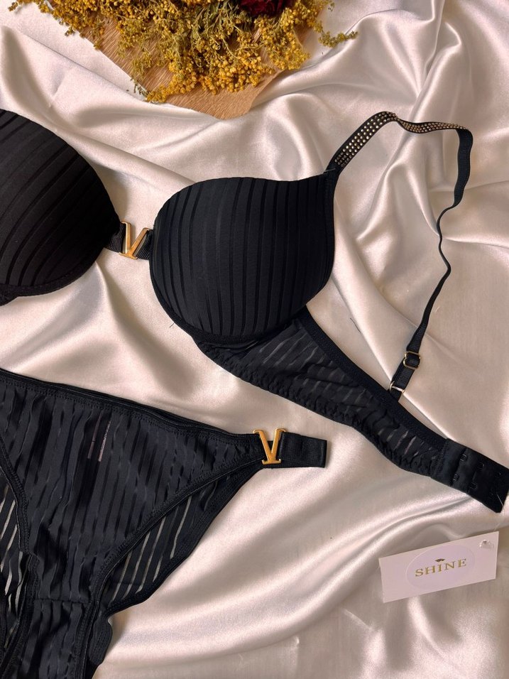Siyah sütyen, ince dikey çizgiler ve altın detaylarla sade ve şık. Ayarlanabilir askılı, konforlu kapanışlı. Lütfen beden belirtiniz.