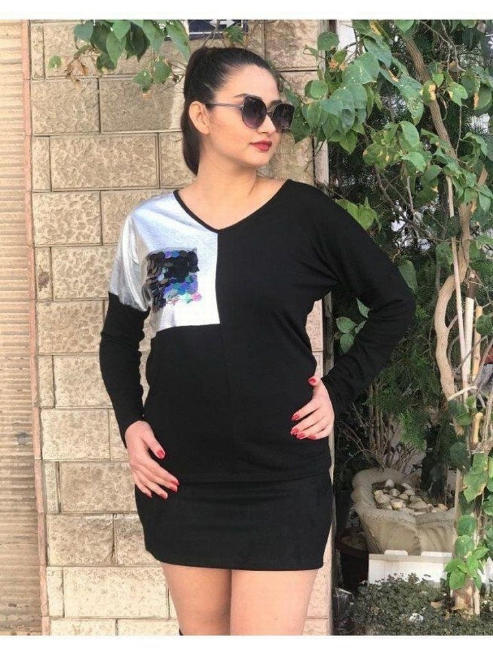Siyah renkli, uzun kollu, V yaka ve bol kesim kadın bluz Omuzda parlak gümüş payet detaylı baskılı tasarıma sahip, günlük kullanıma uygun.