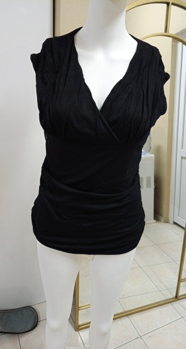 Siyah, V yaka ve kolsuz, drapeli bluz. esnek penye kumaştan normal boyda.